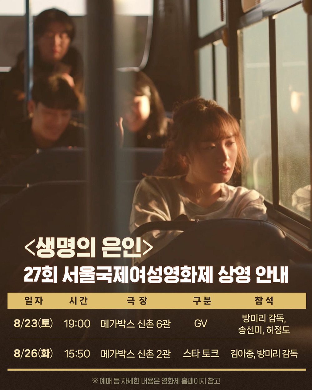 <생명의 은인>은 오는 8월 23일(토) 오후 7시 메가박스 신촌 6관에서 영화 상영 후, 배우 송선미, 허정도, 방미리 감독이 참석한 가운데, 관객과의 대화를 진행한다. 이어 8월 26일(화) 오후 3시 50분 메가박스 신촌 2관에서는 상영을 진행하고, 영화가 끝난 후에는 서울국제여성영화제 1,2대 홍보대사이자 매년 ‘스타 토크’ 프로그램에 참여해 서울국제여성영화제를 빛내온 김아중 배우가 <생명의 은인> GV에 참석해 방미리 감독과 함께 영화 속 인물들의 관계와 선택의 의미 등에 대한 다채로운 이야기를 나눌 예정이다.